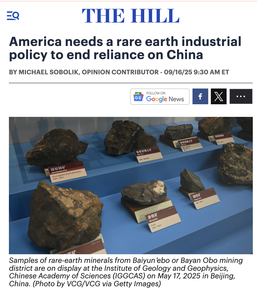 In a recent The Hill opinion piece, Michael Sobolik makes a sobering case: America’s dependence on China for rare earth minerals is a direct threat to national security. With 85% of global rare earth processing controlled by Beijing, and nearly 80% of U.S. defense systems relying on these minerals, the time for half-measures is over.
